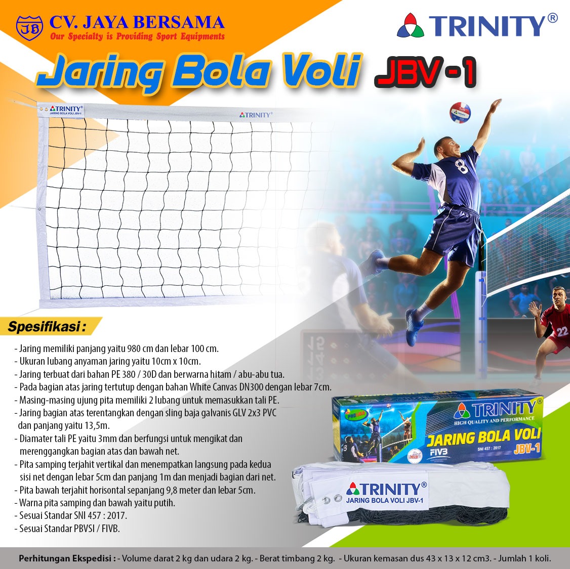 Spesifikasi Jaring Bola Voli JBV-1 (Volleyball Net) merek Trinity sebagai berikut :
