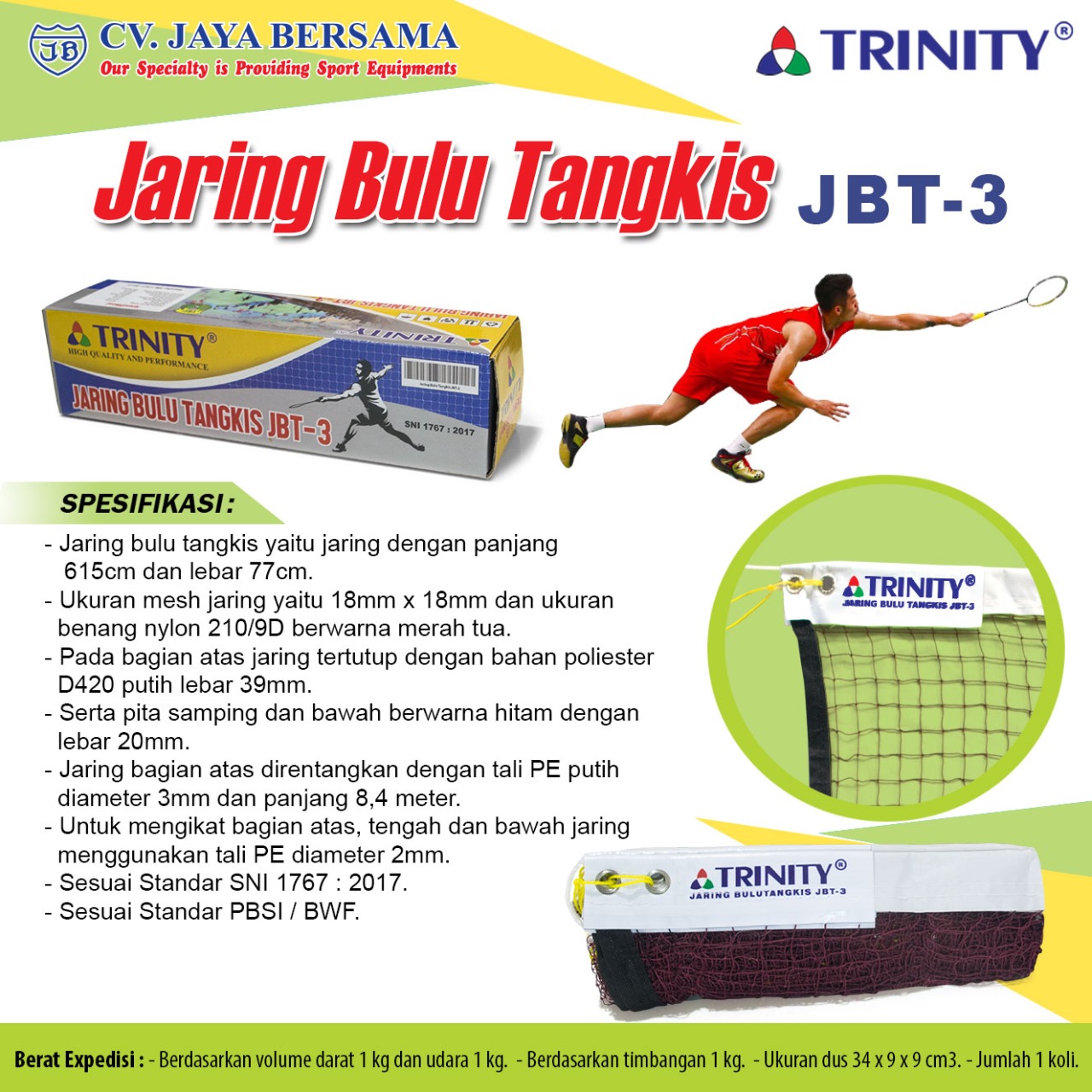 Spesifikasi Jaring Bulu Tangkis JBT-3 merek Trinity adalah sebagai berikut :