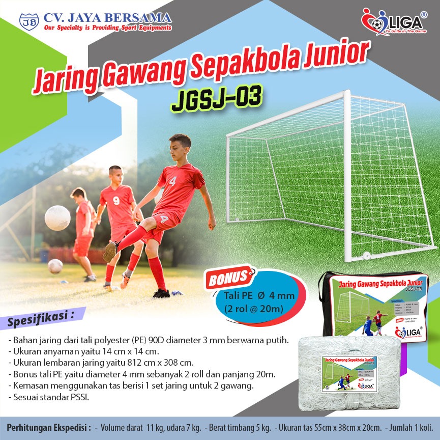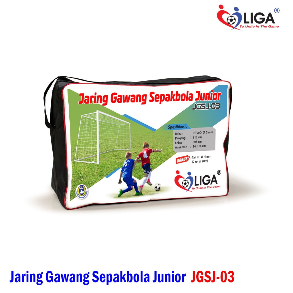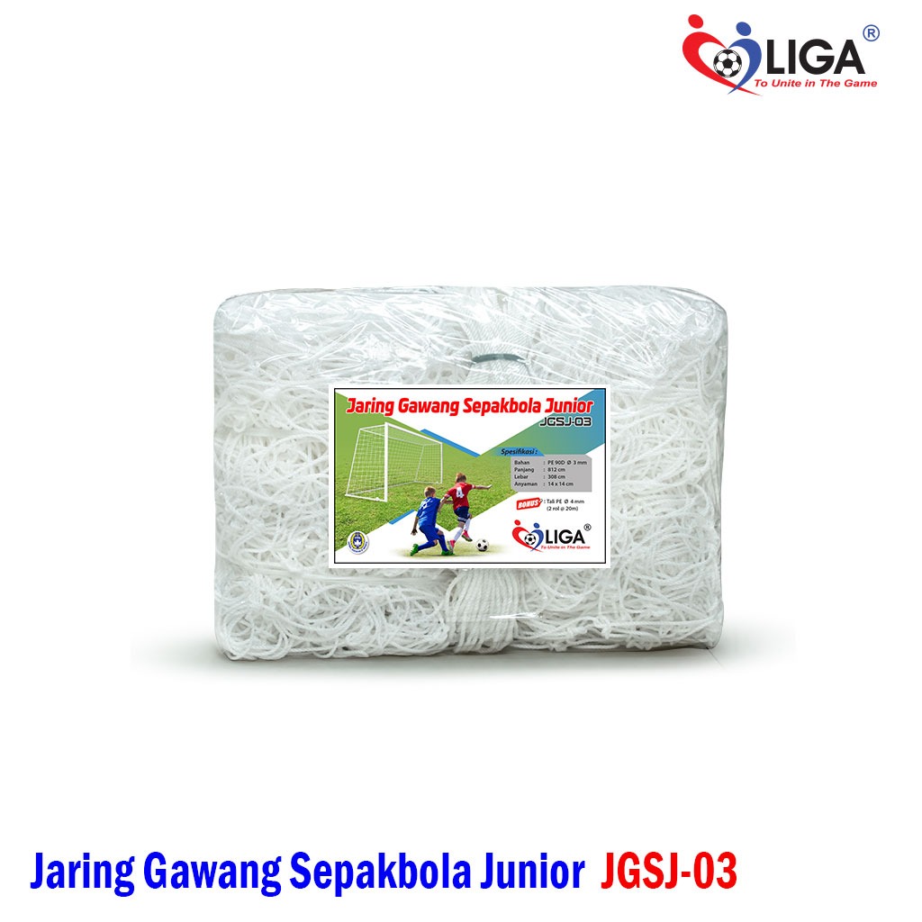 Spesifikasi Jaring Gawang Sepakbola Junior JGSJ-03 merek Liga adalah sebagai berikut :