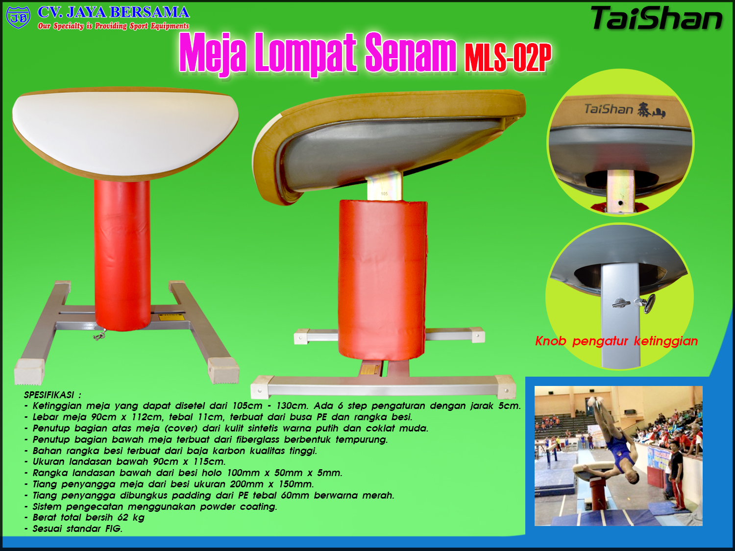 Spesifikasi Meja Lompat Senam MLS-02P merk TaiShan sebagai berikut: