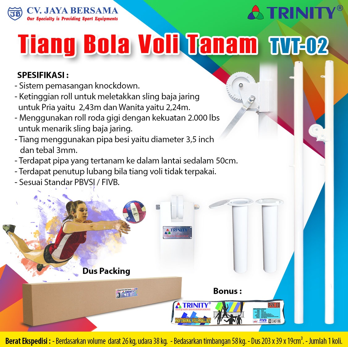 Spesifikasi Tiang Bola Voli Tanam TVT-02 merek Trinity sebagai berikut :