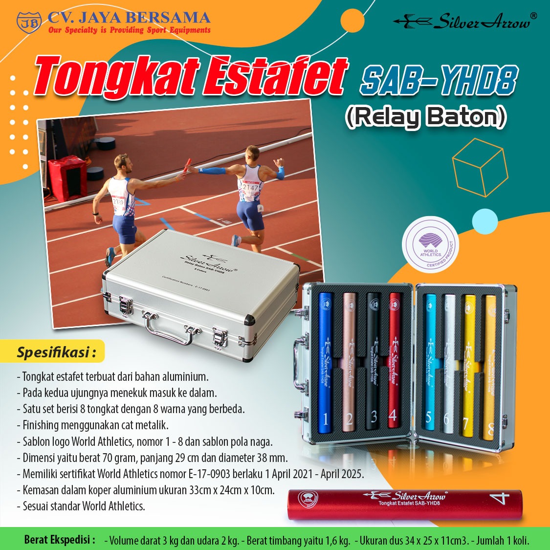Spesifikasi Tongkat Estafet SAB-YHD8 (Relay Baton) merek Silver Arrow sebagai berikut :